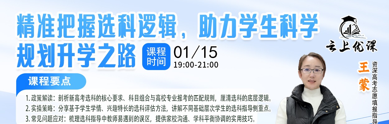 要点 1. 政策解读:剖析新高考选科的核心要求、科目组合与高校专业报考的匹配规则,厘清选科的底层逻辑。 2. 实操策略:分享基于学生学情、兴趣特长的选科评估方法,讲解不同基础层次学生的选科指导侧重点。 3. 常见问题应对:梳理选科指导中教师易遇到的误区,提供家校沟通、学科平衡协调的实用技巧。